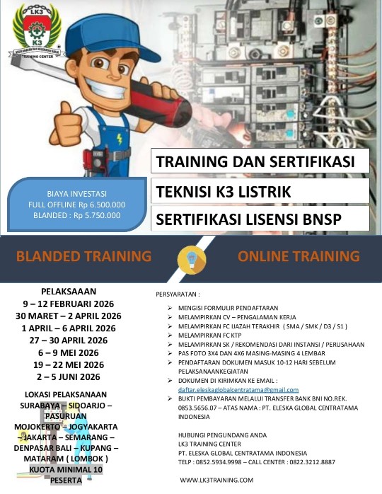 TEKNISI LISTRIK WAJIB MEMILIKI SERTIFIKASI KOMPETENSI - TRAINING DAN SERTIFIKASI BNSP PETUGAS TEKNISI K3 LISTRIK